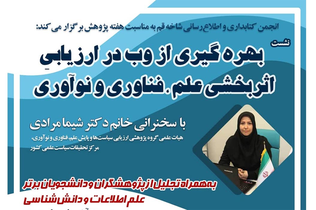 نشست علمی بهره گیری از وب در ارزیابی اثربخشی علم، فناوری و نوآوری با سخنرانی دکتر شیما مرادی، عضو هیأت علمی مرکز تحقیقات سیاست علمی کشور جمعه ۲۸ آذر ماه ۹۹، ساعت ۱۹ از طریق سامانه آموزش مجازی مرکز علمی و کاربردی جهاد دانشگاهی قم (امجد) برگزار خواهد شد. همچنین در این نشست از پژوهشگران و دانشجویان برگزیده علم اطلاعات و دانش شناسی استان قم تجلیل به عمل خواهد آمد.